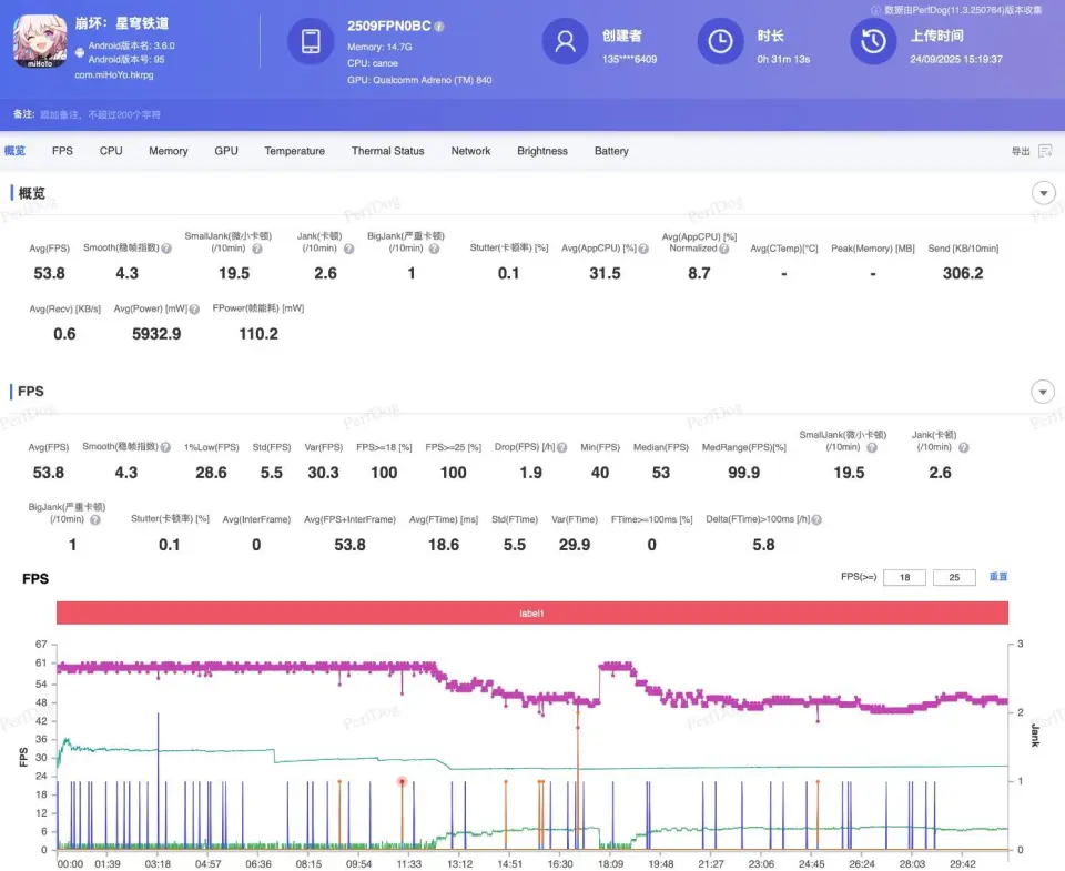 作为对比,小米17 Pro Max画面帧数表现会更稳定一些,平均帧率为53.8 FPS,1%的Low帧为28.6 FPS,每10分钟出现19.5次微小卡顿,2.6次卡顿和1次严重卡顿。