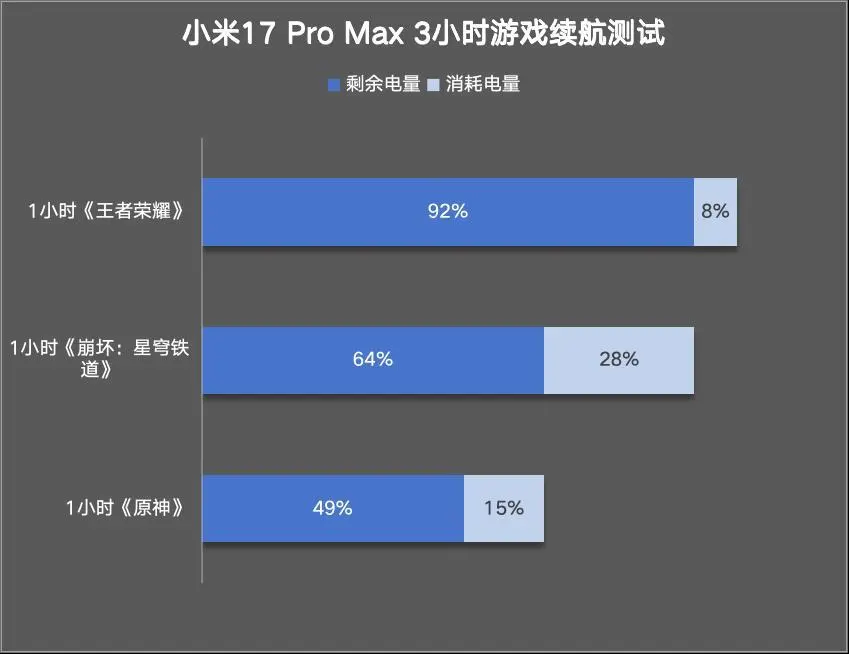 而小米17 Pro Max游玩1小时《王者荣耀》,耗电8%;1小时《崩坏:星穹铁道》,耗电28%;1小时《原神》,耗电15%,最终剩余电量49%。