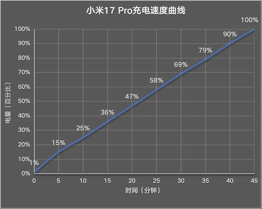 手机电量剩余1%的状态下为小米17 Pro充电,5分钟充电15%;10分钟充电25%;15分钟充电36%;20分钟充电47%;25分钟充电58%;30分钟充电69%;35分钟充电79%,40分钟充电90%,45分钟充至100%。