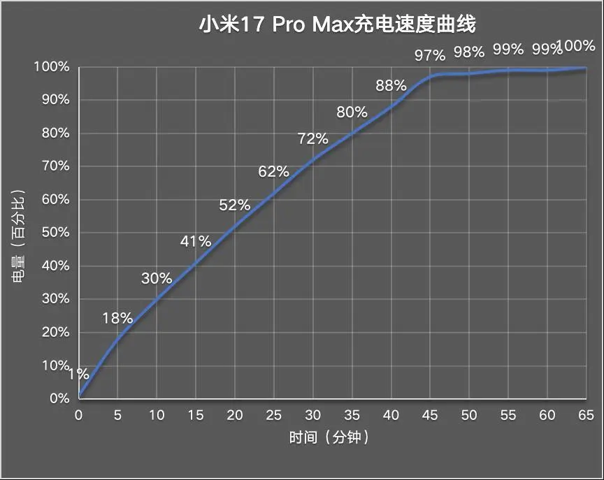 对比小米17 Pro,小米17 Pro Max充电速度会更慢一些,5分钟充电18%;10分钟充电30%;15分钟充电41%;20分钟充电52%;25分钟充电62%;30分钟充电72%;35分钟充电80%,40分钟充电88%,45分钟充至97%,50分钟充至98%,55分钟~60分钟充电至99%,65分钟充至100%。