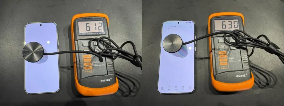 经实测,纯白背景下,关闭自动亮度,手动将屏幕亮度拉到最高,小米17 Pro屏幕手动最大亮度为612尼特,小米17 Pro Max则是630尼特。