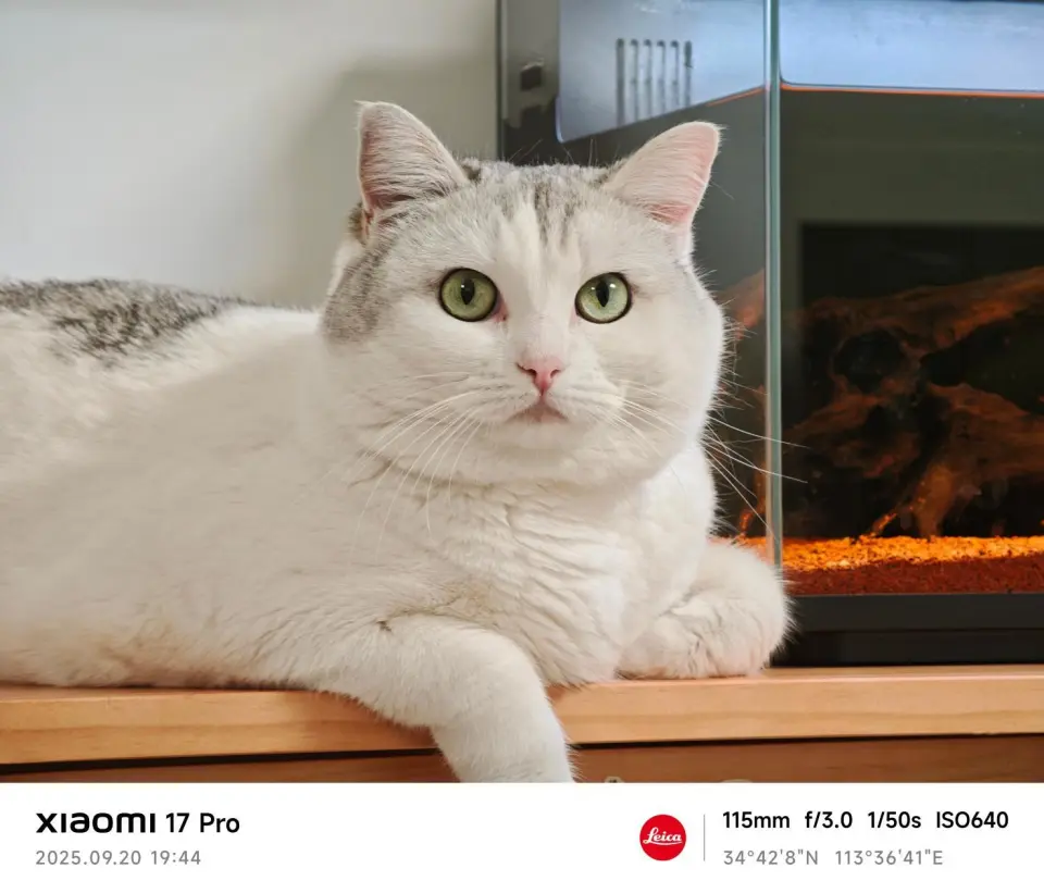 鱼缸顶部的白色灯条照射的光线打到了安兔兔玩偶的面部,形成了一束轮廓光,玩偶右侧被一旁的砂石染成了黄色,同时背景还有白光穿过。小米17 Pro几乎做了所见即所得,与人眼相差无几。