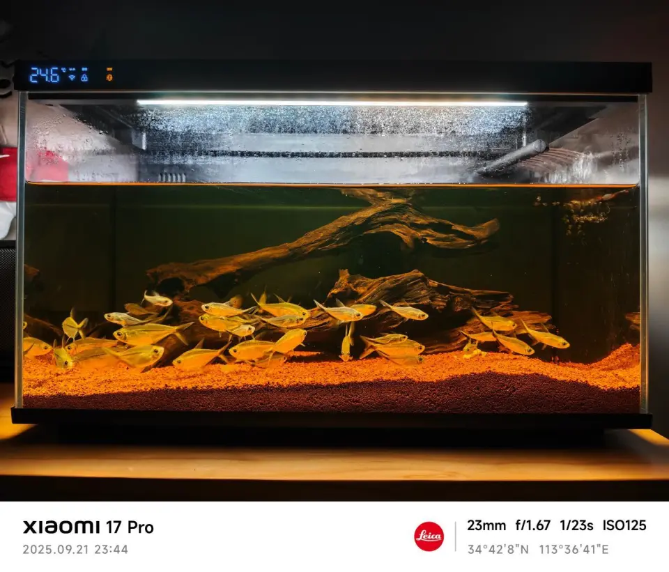 到了晚上,小米17 Pro系列的夜景表现还可以,下面这张鱼缸周围的光线十分复杂,比如顶部的白色灯条,桌面的光影,小鱼与砂石之间的颜色变化等,层次分明。