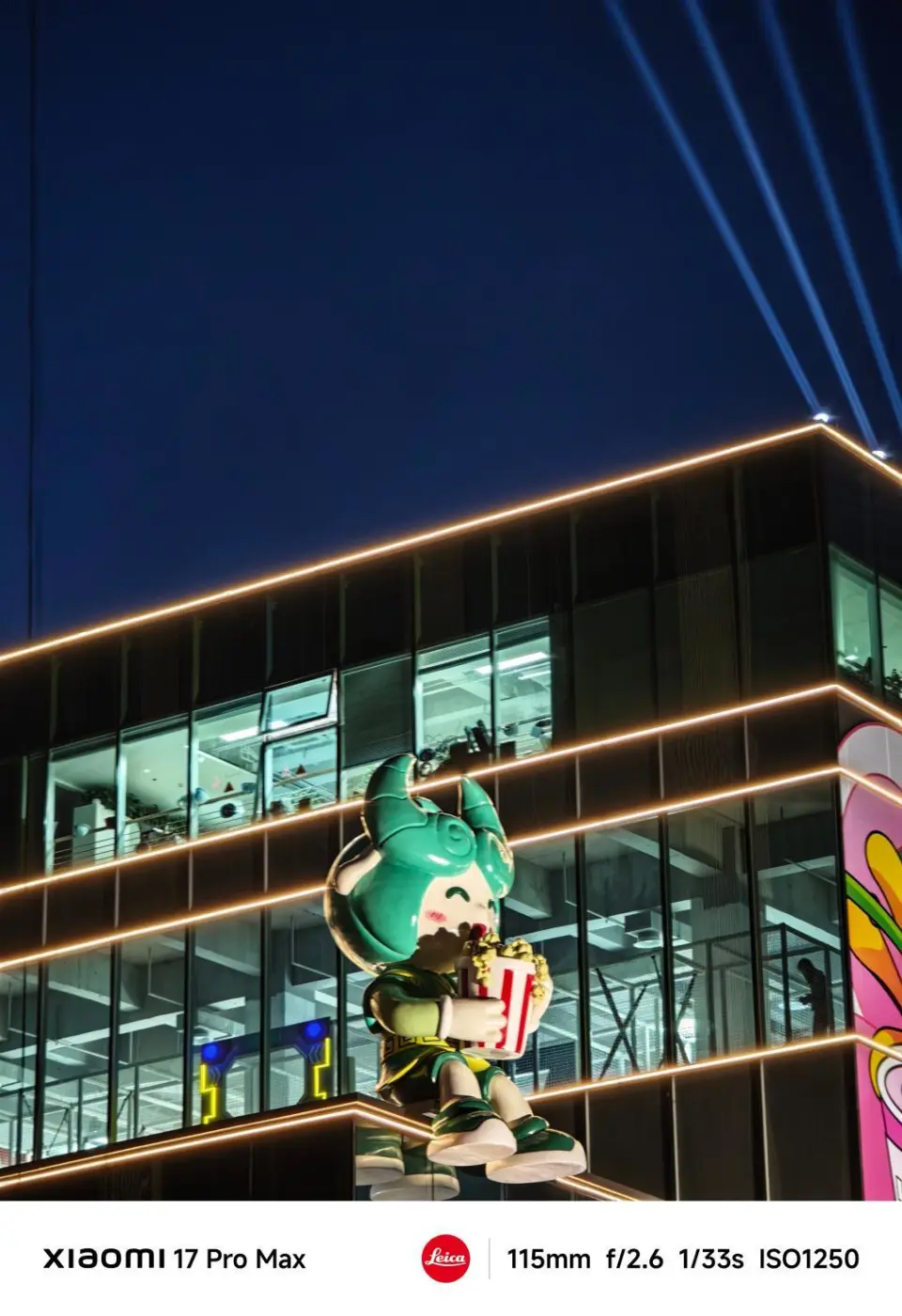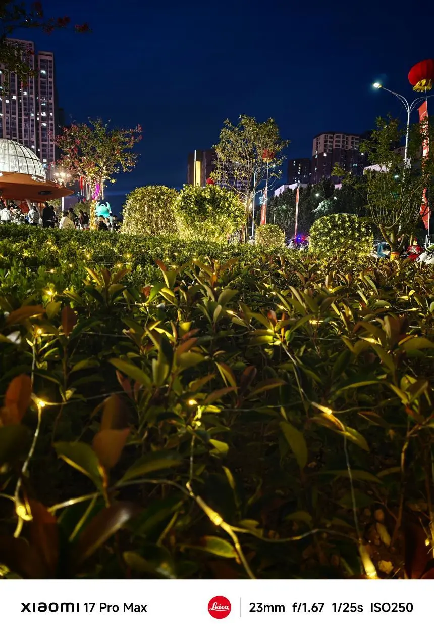 而小米17 Pro Max的长焦在暗光环境下的表现也很不错,天空没有出现明显的噪点,建筑上的灯条没有压得太暗,同时保留了墙壁上的纹理细节。