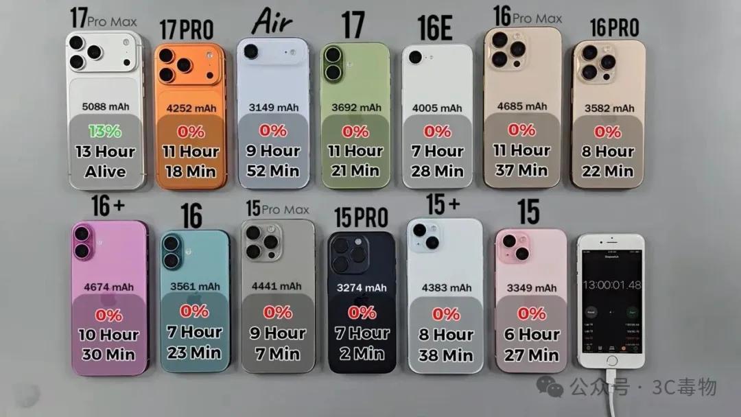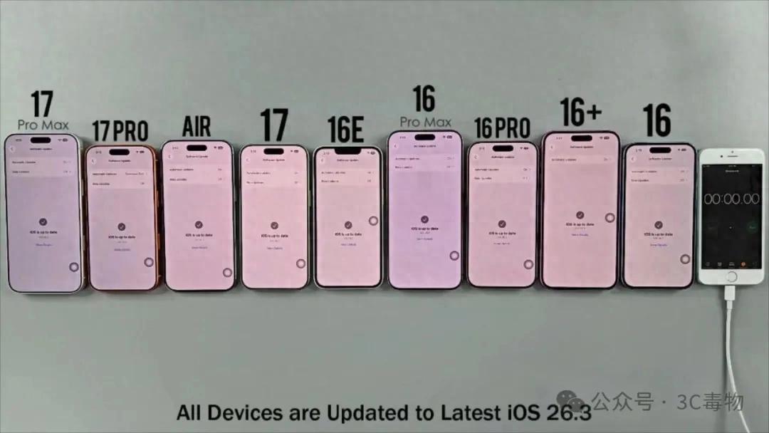 但电池电量全部耗尽之后,这9款升级到iOS26.3版本iPhone的续航结果分别为。