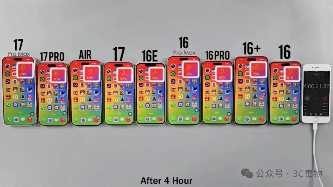 续航4小时之后,这9款升级到iOS26.3版本的iPhone剩余电池电量百分比结果分别为。