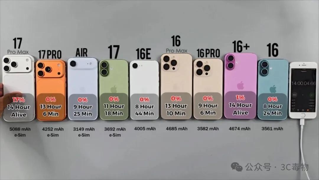 iPhone17ProMax,续航14小时之后,依然还有17%电量,排名第一。