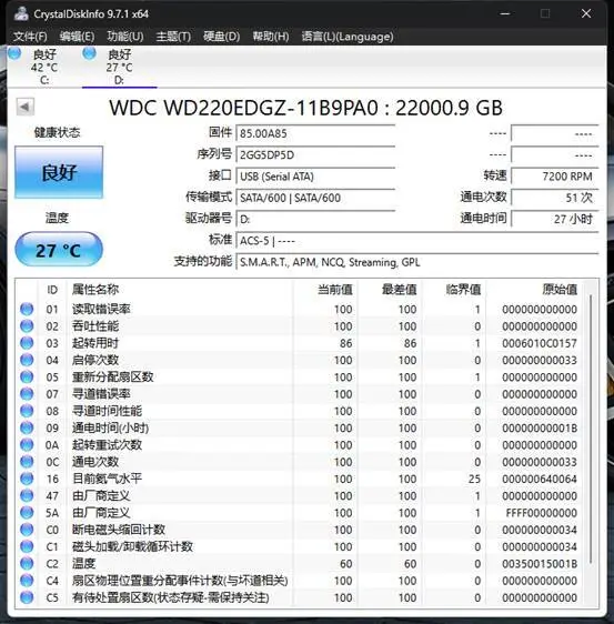 西数My Book™台式硬盘提供了高达26TB的可选存储容量,这对于家庭用户来说是一个巨大的存储空间。这次我们测试的是22TB的版本,在实际测试中,我们发现硬盘在电脑上显示的实际容量为22000.9GB,这与厂商标注的容量基本一致。由于硬盘厂商通常按照1TB=1000GB来计算容量,而电脑设备则按照1TB=1024GB来计算,因此会存在一定的显示差异。不过,这并不影响硬盘的实际使用容量,用户可以放心地存储大量的照片、视频、音乐和重要文档。