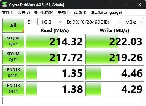 在CrystalDiskMark的测试中,台式硬盘1GB文件单线程8队列深度的顺序读取速率为214.32MB/s,写入速度也有222.03MB/s。在16线程32队列的随机读写测试中,1GB测试的随机读取速率为217.72MB/s,随机写入速度为219.26MB/s。这表明硬盘在处理大文件时具有出色的读写性能,能够快速完成数据传输任务。