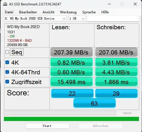 AS SSD Benchmark的测试结果与CrystalDiskMark类似,硬盘的顺序读取速度为207.39MB/s,写入速度为207.06MB/s。这进一步验证了硬盘在连续读写方面的高效性能,无论是拷贝电影、照片还是其他大文件,都能在短时间内完成,大大提高了用户的使用效率。