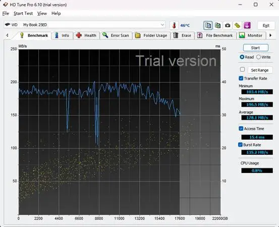 我们还使用了HD Tune Pro软件对硬盘进行了基准测试,读取测试最高速率达到196.5MB/s,最低103.4MB/s,平均读取速度达到了178.1MB/s。这一结果表明硬盘在长时间的读取操作中能够保持稳定的性能,不会出现明显的速度波动。
