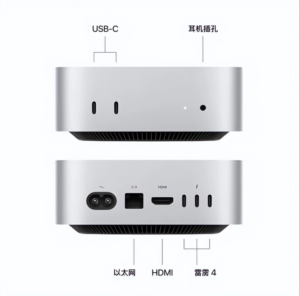 接口方面前侧有两个USB-C端口,速率10Gb/s,后侧是千兆网卡接口,HDMI接口,3个雷雳4,速率40Gb/s。