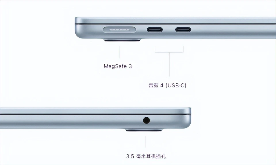 接口有MagSafe 3充电口,两个雷电4,1个3.5mm耳机孔。支持Wi-Fi 6E,蓝牙5.3,4扬声器,3麦克风,重量1.24Kg。